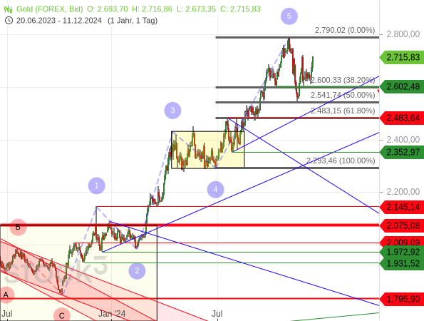 Der Bruch dieser Linie wurde anschließend durch einen Rücksetzer getestet und bestätigt. Dadurch ist das Chartbild nun kurzfristig wieder bullish – abgesehen davon, dass das Zwischenhoch vom 25. November noch nicht überschritten wurde und damit noch eine Tendenz tieferer Hochs vorliegt.