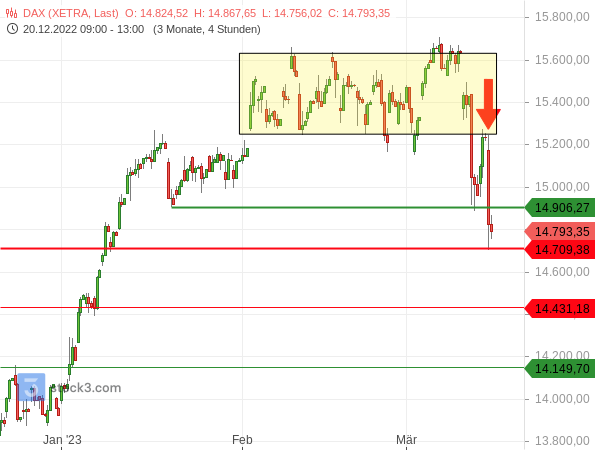 Gleiches gilt für den DAX, der gestern in der Spitze 3,5 % einbüßte. Der deutsche Leitindex ist damit sehr klar von seiner Seitwärtsrange (gelb im folgenden Chart) nach unten abgeprallt, die seit Anfang Februar eine Relevanz hatte. Der zuvor bearishe Ausbruch aus dieser Range wurde somit bestätigt.