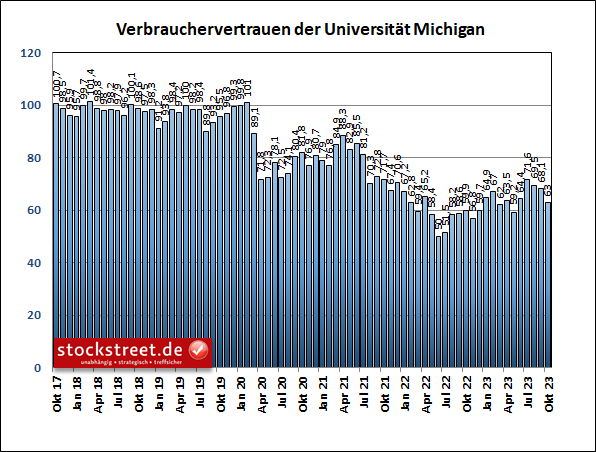 Dass die Daten derart stark ausgefallen sind, ist auch deshalb überraschend, weil erst am vergangenen Freitag noch gemeldet wurde, dass sich die Konsumstimmung stärker als erwartet eingetrübt hat – angeblich wegen der hartnäckig hohen Inflation in den USA. Darauf deutet zumindest das Barometer der Uni Michigan für die Verbraucherlaune hin, das im Oktober auf nur noch 63,0 Zähler fiel, von 68,1 Punkten im September. Experten hatten lediglich einen Rückgang auf 67,2 Punkte erwartet.