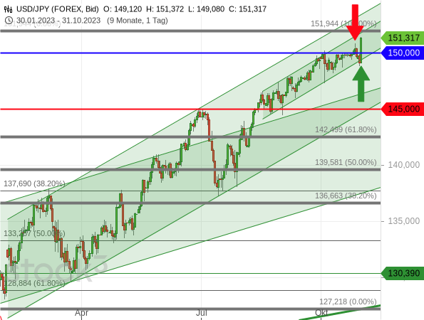 Der Devisenmarkt war von diesen Aussichten offenbar enttäuscht. Denn der Yen zeigte gestern wieder deutliche Schwäche. Gegenüber dem US-Dollar kehrt er über die 150er Marke zurück (siehe grüner Pfeil im folgenden Chart), an der es kurz zuvor eine Bullenfalle gegeben hatte (roter Pfeil).