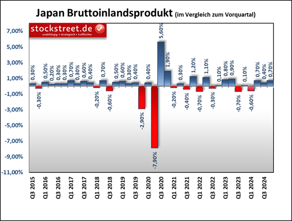 Der Druck auf die Bank of Japan, die Geldpolitik weiter zu straffen, wächst auch angesichts stärkerer Daten zum Wirtschaftswachstum. Schon im Schlussquartal 2024 überzeugte das Bruttoinlandsprodukt (BIP) mit +0,7 % zum Vorquartal.