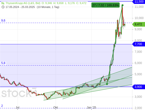 Mit anderen Worten: Der Aktienkurs von Deutz wurde vornehmlich aufgrund der Zukunftsfantasie bzw. des aktuellen Rüstungs-Hypes nach oben katapultiert, was auch für ThyssenKrupp gilt.