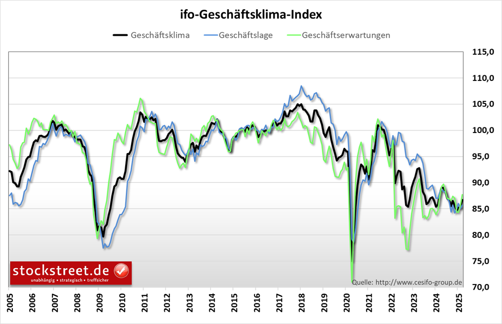 Dabei muss man berücksichtigen, dass die aktuellen Stimmungsverbesserungen in Deutschland auf einem relativ niedrigen Niveau stattfinden. Denn beim ifo-Geschäftsklimaindex kann man weniger von einer besseren Laune, sondern eher von weniger Pessimismus sprechen. Das gilt auch für den Einkaufsmanagerindex der Industrie. Und der Composite-PMI notiert nur hauchdünn über der Schwelle von 50 Zählern, ab der Wachstum signalisiert wird. Das Ifo-Institut hat in seiner jüngst aktualisierten Konjunkturprognose nur ein Mini-Wachstum von 0,2 % für 2025 auf dem Radar.