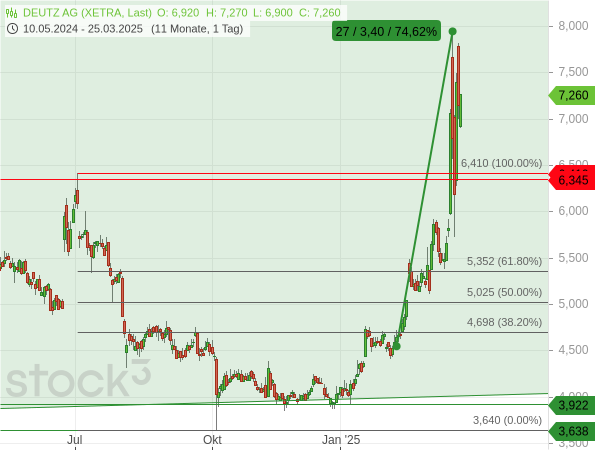 Und die Aktien von Deutz gingen im selben Zeitraum um +75 % durch die Decke, weil das Unternehmen über ein bislang kleines Randgeschäft mit der Rüstungsbranche verfügt.