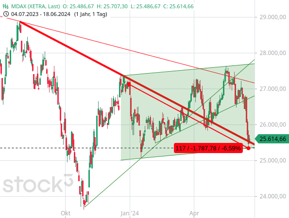 Seit Jahresbeginn lag der Index damit 6,59 % im Minus. Und auch wenn man auf den Kursverlauf des MDAX noch einen Aufwärtstrendkanal legen kann (grün), wird wohl kaum jemand noch behaupten, dass hier derzeit ein Aufwärtstrend vorliegt.