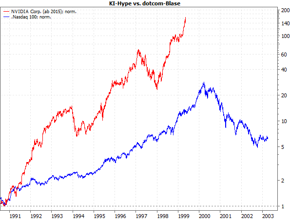Das Aushängeschild für letzteren ist die Aktie des Chiphersteller Nvidia. Und beim direkten Vergleich mit dem Nasdaq 100 der 1990er Jahre zeigt sich, wie weit der Hype schon fortgeschritten ist: