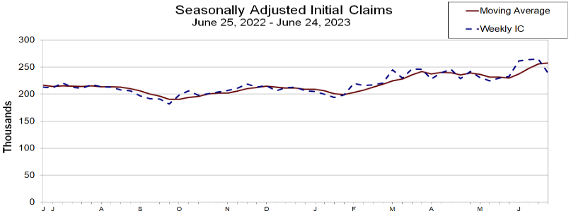 Durch den aktuellen Rückgang auf wieder unter 250.000 hat sich auch der zuletzt erkennbare Aufwärtstrend vorerst nicht fortgesetzt. Ich erinnere in diesem Zusammenhang an meine Analyse vom 11. Mai: „Steigt die Arbeitslosigkeit, fallen die Aktienkurse“. Darin war zu lesen, dass es erst mit einem Überschreiten der kritischen Marke von 270.000 für die Aktienmärkte problematisch werden könnte, da diese als Kipp-Punkt gilt, der eine Verschlechterung des Arbeitsmarkts signalisiert.