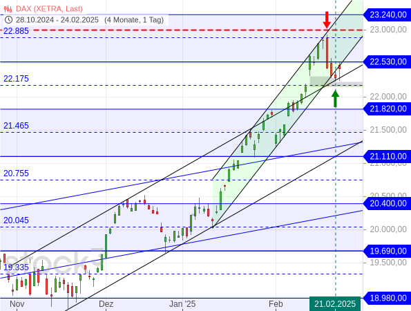 Das neuralgische Niveau lag bei 22.800 Punkten, das der DAX schon am vergangenen Montag erreichte. Nach der Target-Trend-Methode war jedoch die Rechteckmittellinie bei 22.885 Punkten relevant, die ich daher als ein mögliches Ziel nannte. Sie wurde am Dienstag erreicht und am Mittwoch – kurz vor dem starken Rücksetzer – knapp überboten.