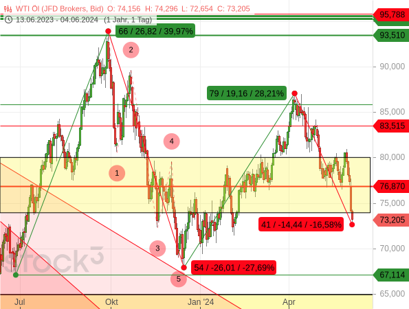 Zwar ist die Höhe des Ölpreises noch als normal zu betrachten, da er sich weiterhin im Bereich der Spanne von rund 74 bis 80 US-Dollar bewegt, die ich als Zielkorridor ausgemacht hatte (gelb), doch vor allem der Kursrutsch der vergangenen Tage wirft derzeit Fragen bei Anlegern auf. Denn derart stark fallende Ölpreise sind immer ein Warnsignal. Schließlich deutet es auf eine geringere Nachfrage hin, was ein Indiz für eine schwache wirtschaftliche Aktivität sein kann.