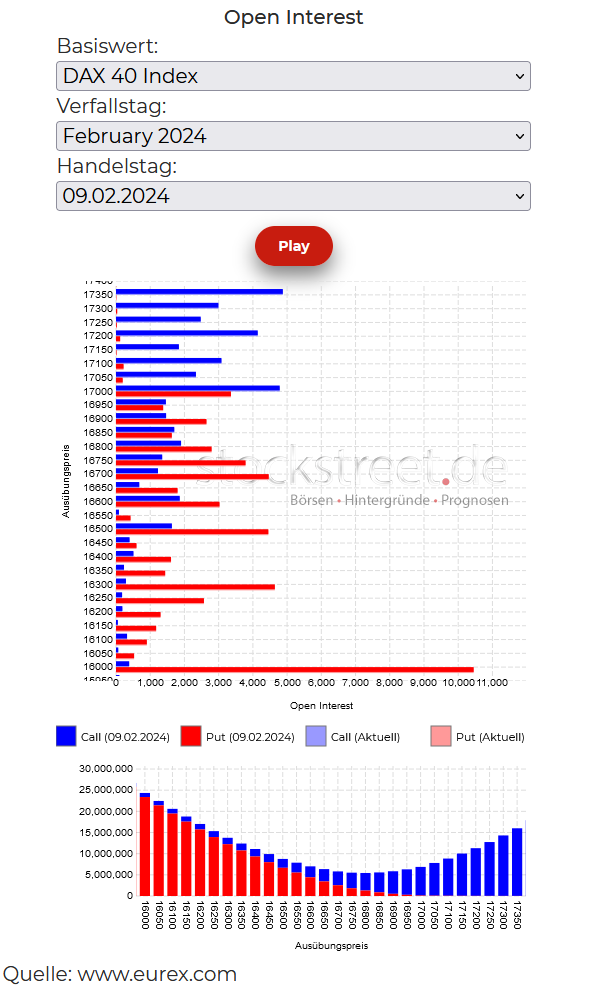 Die Bullen hoffen dagegen überwiegend auf einen Ausbruch darüber – die Call-Positionen (blaue Balken) oberhalb von 17.000 Punkten sind fast durch durchweg größer als darunter. Und unterhalb von 16.500 Punkten liegen kaum noch Calls.