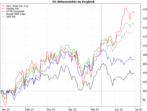 So weit, so klar. Aber es fällt auf, dass ab Mitte Mai die Schere zwischen dem Nasdaq 100 bzw. den anderen marktbreiten Indizes und dem Dow Jones bzw. NYSE Composite nochmals weiter aufgeht (siehe senkrechte Linie im Chart).