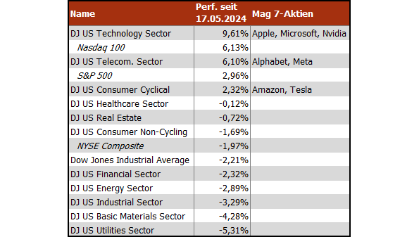 Ab dann ging offenbar die Rally der Tech-Werte in die nächste Runde. Doch ein Blick auf die Sektor-Performance seitdem zeigt, dass keineswegs nur die Tech-Werte überproportional stiegen: