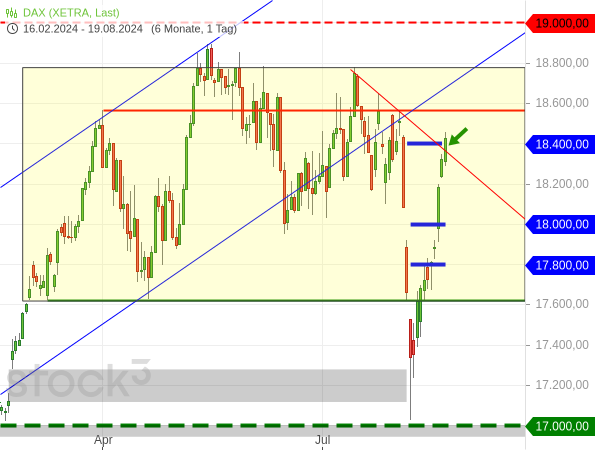 Danach verschwand der „Verfallstagsdruck“, sodass die Kurse wieder nachgaben. Da aber die US-Märkte weiter zulegten, wurde der DAX wieder mit hochgezogen. Und gestern war der DAX dabei, eine wichtige Abwärtslinie zu überwinden (siehe Pfeil).