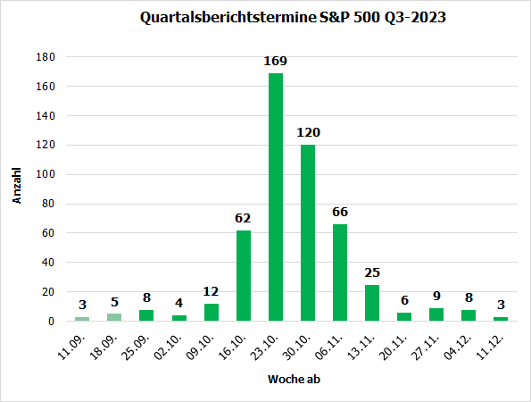 Sicher, bis zum Beginn der heißen Phase der Berichtssaison werden noch fast 3 Wochen vergehen (siehe folgende Grafik): Wie inzwischen üblich, nachdem Alcoa 2016 aus dem S&P 500 ausschied, werden die Großbanken aus dem S&P 500 den „offiziellen“ Beginn am 13.10.2023 einläuten.