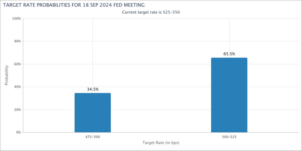 Eine Senkung um 50 Basispunkte, die immerhin mit einer Wahrscheinlichkeit von 34,5 % erwartet wird, kann man dagegen ausschließen. Dafür ist die Inflation noch zu hoch, die Wirtschaft noch zu stark und die Stimmung am Markt wieder weit weg von Panik.