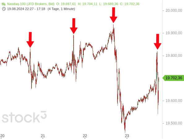Dennoch legten die Aktienmärkte in einer ersten Reaktion wieder deutlich zu. Dabei fällt aber seit einigen Tagen auf, dass sich die Kurse zwar tendenziell nach oben bewegen, dies aber nur noch relativ langsam geschieht und sie zwischenzeitlich immer wieder von scharfen Rücksetzern zurückgeworfen werden, bei denen es binnen weniger Minuten gut und gerne um weit mehr als 100 Punkte mit den Aktienindizes abwärts geht, wie der folgende Chart des Nasdaq 100 zeigt.