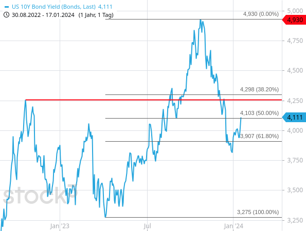 Am Anleihemarkt sieht es anders aus. Dort hat sich bereits eine Trendwende etabliert – hin zu wieder höheren Zinsen. Unterbrochen von einem kleinen Rücksetzer, zieht die Rendite der 10-jährigen US-Staatsanleihe inzwischen mit einer zweiten dynamischen Aufwärtsbewegung an.