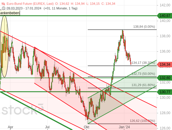 Noch etwas dynamischer stellt sich der Renditeanstieg bzw. der Rückgang der Anleihekurse hierzulande dar. Der Bund-Future hat mit dem gestrigen Tage exakt 38,20 % seines äußerst starken Kursanstiegs korrigiert, wobei die Abwärtsbewegung in einem ähnlich hohen Tempo wie die Aufwärtsbewegung erfolgt.