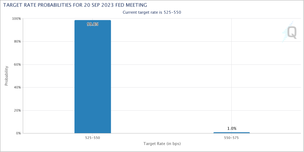 Die chinesische Zentralbank hat gestern beschlossen, die Leitzinsen trotz der konjunkturellen Flaute unverändert zu belassen. Das war vom Markt so erwartet worden und somit keine Überraschung. Auch für die gestrige Zinssitzung der US-Notenbank hatten die Marktteilnehmer mit großer Mehrheit eine Beibehaltung der derzeitigen Geldpolitik erwartet. Mit einer Wahrscheinlichkeit von 99 % wird derzeit laut dem „FedWatch Tool“ der CME zumindest eine Pause im Zinsanhebungszyklus eingepreist.