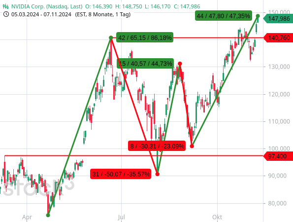 Durch den jüngsten Kursanstieg der NVIDIA-Aktien um bislang mehr als 12 % (!) seit Ende Oktober, also binnen nur einer Woche (!), hat der Nasdaq Composite um mehr als 6 % zugelegt und ein neues Rekordhoch erreicht – fahnenstangenartig. Letzteres spricht häufig dafür, dass ein Trend in seine Endphase gegangen ist. Vor diesem Hintergrund sollte man beachten, dass man den Kursanstieg des Nasdaq Composite seit dem Tief von Anfang August 5-gliedrig zählen kann.