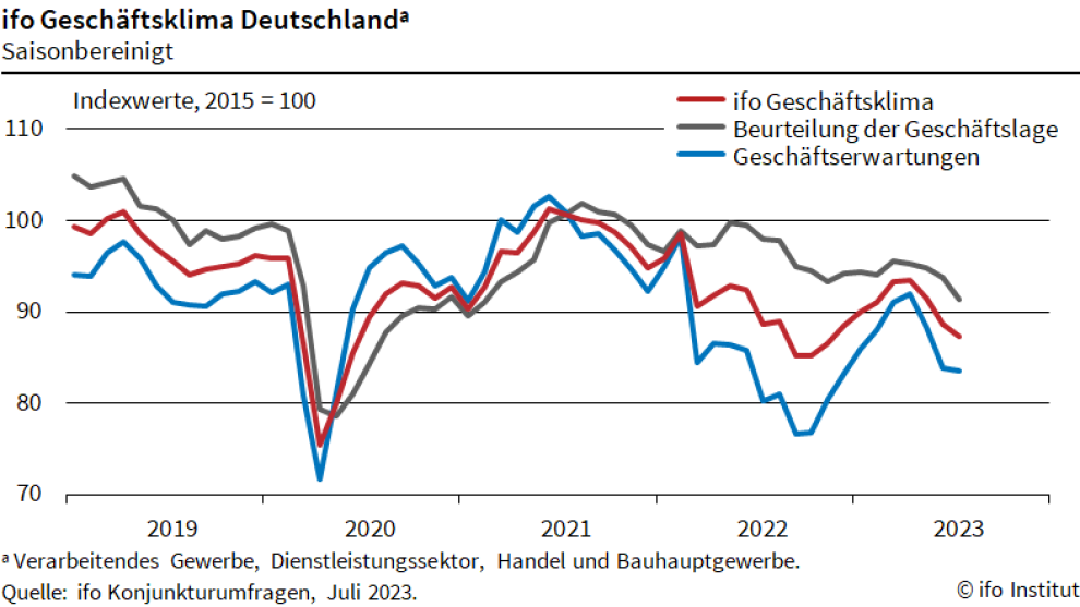 Nach Auffassung des Münchner ifo-Instituts wird das Bruttoinlandsprodukt (BIP) im laufenden 3. Quartal 2023 voraussichtlich wieder sinken, nachdem es im Frühjahr in etwa stagniert haben dürfte. Grund für diese Annahmen ist die Entwicklung des ifo-Geschäftsklimas, wonach sich die Stimmung in den Chefetagen der deutschen Wirtschaft im Juli erneut eingetrübt hat – das 3. Mal in Folge. Der ifo-Geschäftsklimaindex sank auf 87,3 Punkte, von 88,6 Zählern im Juni, und damit deutlich stärker als erwartet (88,0).