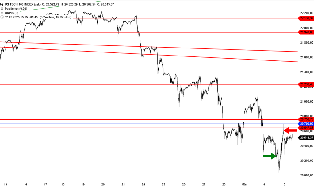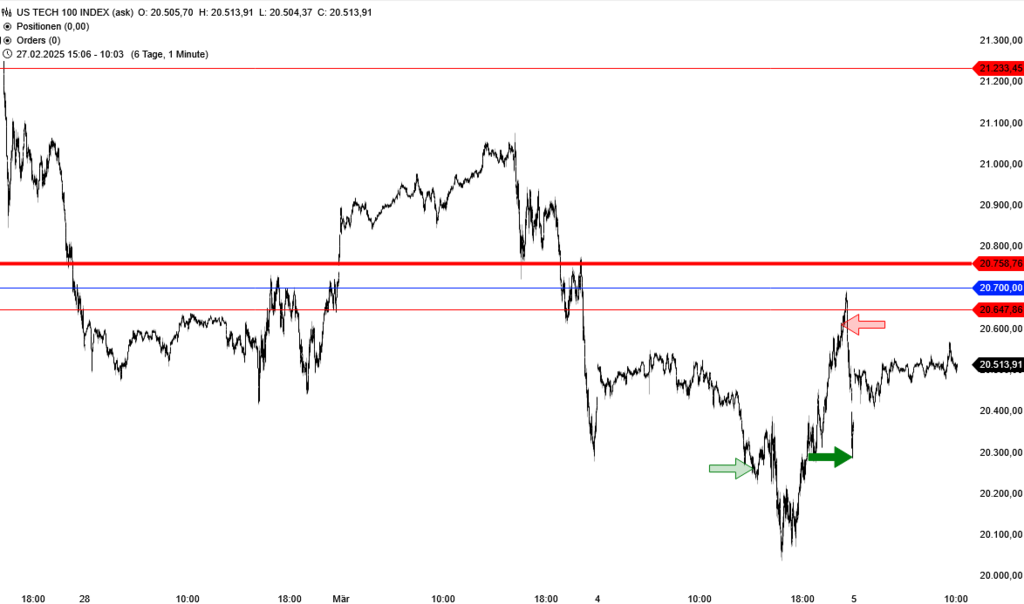 Für kurzfristige Trader kann das wilde Auf und Ab sehr lukrativ sein. Vorgestern ist es uns beim Trading-Dienst „Target-Trend-CFD“ zum Beispiel gelungen, bei 20.259 Punkten mit einer Long-Position in den Nasdaq 100 zu kommen (siehe grüner Pfeil im folgenden Chart). Das ist ein recht niedriges Niveau, schließlich hatte der US-Technologieindex bis dorthin von seinem erst am 18. Februar markierten Rekordhoch nach nur 10 Handelstagen fast 9 % verloren.