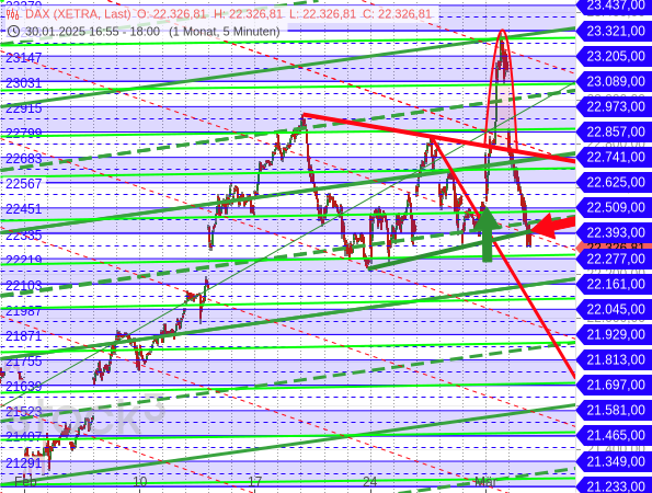 Doch am vorgestrigen (Faschings-)Dienstag folgte ein dramatischer Absturz, mit der sich der bullishe Ausbruch als derbe Bullenfalle entpuppte (roter Bogen). Vom Rekordhoch bis zum Tagestief rauschten die Kurse um fast 1.000 Punkte bzw. mehr als 4,2 % abwärts. Dabei wurden sogar die Aufwärtstrendlinie (dick grün) gebrochen (roter Pfeil) und die drei Tiefs vom 25. und 28. Februar an der Mittellinie bei 22.335 Punkten unterschritten, womit die Folge höherer Tiefs gestört wurde.